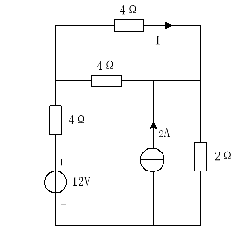 1. 节点电压法求解: 设上节点电压为 \(V_a\),下节点为地(0V)。 2. 列写 KCL 方程: - 左侧支路电流:\((V_a - 12) / 4\) - 中间支路电流:\(-2A\) (流入节点) - 右侧支路电流:\(V_a / 2\) 方程:\(\frac{V_a - 12}{4} - 2 + \frac{V_a}{2} = 0\) 3. 解方程: 同乘 4 得:\((V_a - 12) - 8 + 2V_a = 0\) \(3V_a - 20 = 0 \Rightarrow 3V_a = 20 \Rightarrow V_a = \frac{20}{3} V \approx 6.67V\) 4. 求电流 I: 假设 I 为最右侧电阻上的电流(向下): \(I = \frac{V_a}{2} = \frac{6.67}{2} \approx 3.33A\)。 (注:若图示右侧电阻为 2Ω,电源为 12V/4Ω,计算如上;请根据实际数字核对)