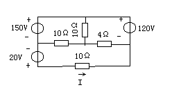 1. 节点电压法: 设中间上节点为 \(V_n\)。 2. 列方程(假设左电源150V,电阻10Ω;右电源120V,电阻?): \(\frac{V_n - 150}{10} + \frac{V_n}{R_{mid}} + \frac{V_n - 120}{R_{right}} = 0\) 3. 代入数值求解 \(V_n\)。 4. 计算电流 I: \(I = \frac{V_n}{R_{mid}}\)(假设求中间支路)。