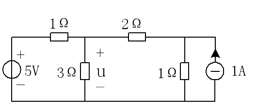1. 电压源(5V)单独作用: - 电流源(1A)开路。 - 电路变为单回路:5V电源、\(3\Omega\)、\(1\Omega\) 串联。 - 电路电流 \(I' = \frac{5}{3+1} = 1.25A\)。 - \(3\Omega\) 两端电压 \(U' = I' \times 3 = 1.25 \times 3 = 3.75V\)(上正下负)。