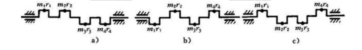 在图示 a、b、c 三根曲轴中,已知 \(m_1r_1=m_2r_2=m_3r_3=m_4r_4\),并且作轴向等间隔布置,且都在曲轴的同一含轴平面内,则其中 abc 轴已达静平衡, c 轴已达动平衡。